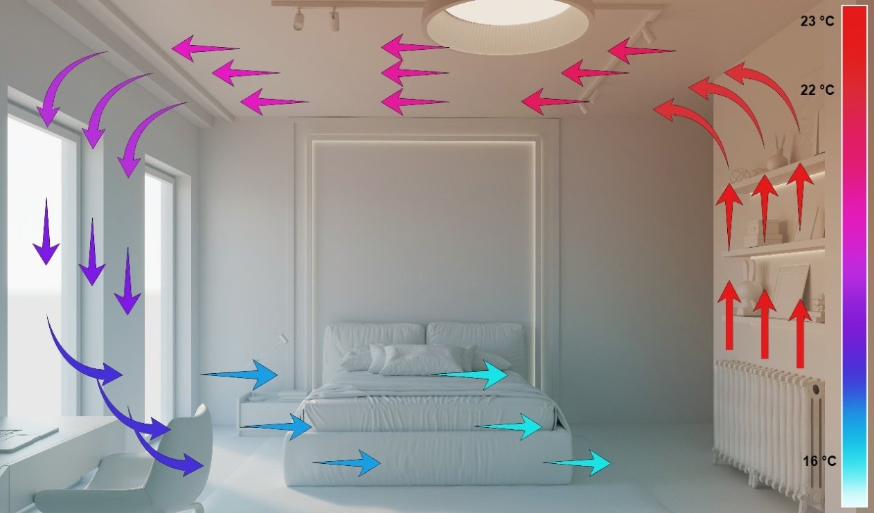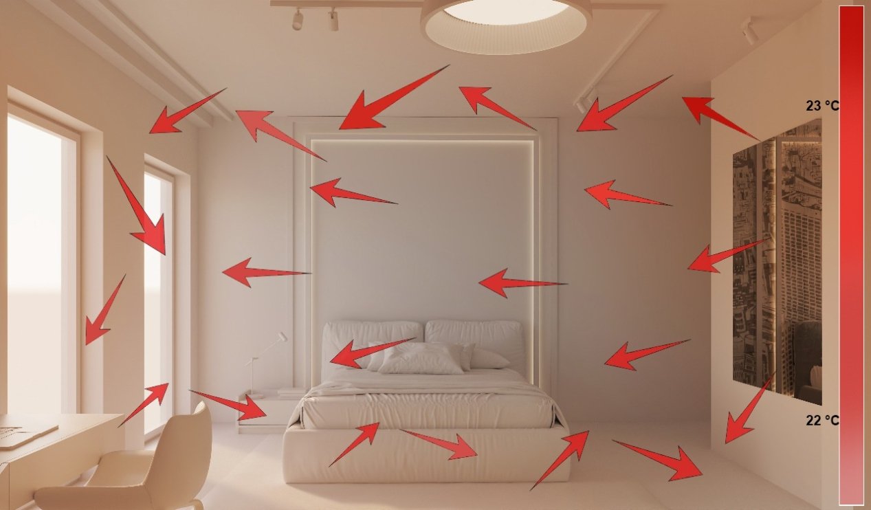 Ngrohje e shperndarë propercionalisht në të gjithë dhomën. Valët infra të kuqe ngrohin trupat, (Muret, Tavanin, Dyshemen, Mobiljet…), e akumulojn ngrohjen përmes valëve infra të kuqe dhe e kthejn mbrapa në ambientin e dhomës +- 10%, duke mbetur ajri i freskët në dhomë.